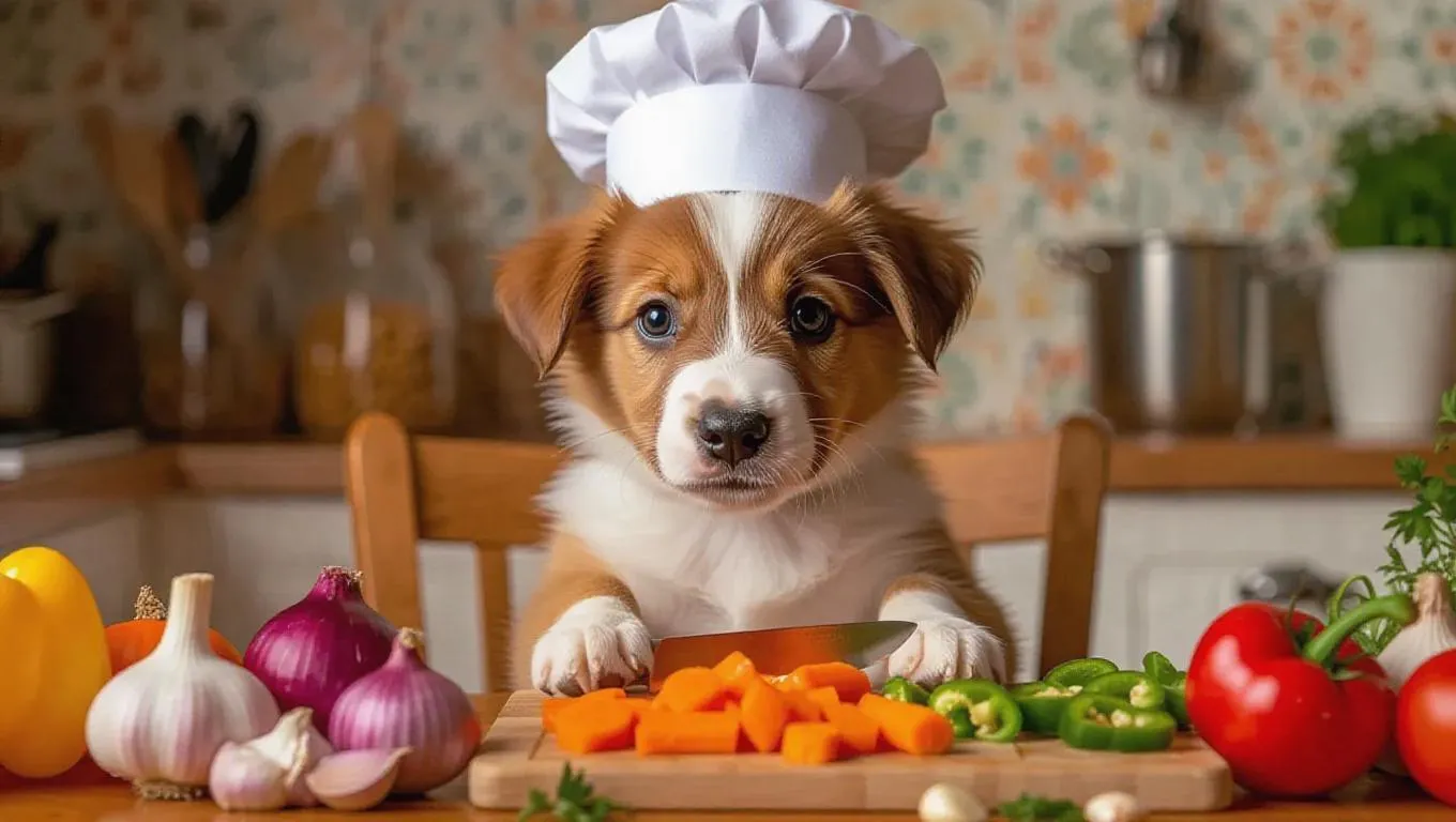 An enthusiastic puppy wearing a tiny cook’s hat is prepping vegetables in a colorful, inviting kitchen. Using a knife to chop carrots and peppers on a cutting board, surrounded by ingredients like onions, garlic, and spices. After finishing, the puppy sits on a chair, eyeing a fresh vegetable stir-fry.