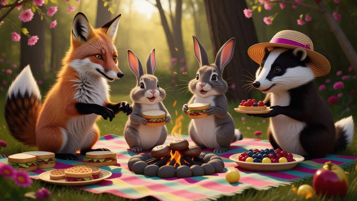 A lively outdoor picnic scene featuring an imaginative fox, a cheerful rabbit, and a crafty badger preparing a feast. The fox skillfully grills mushrooms over a small fire, the rabbit crafts delightful sandwiches with flair, and the badger artfully arranges picked berries on a platter. Colorful picnic blankets, diverse fruits, and charming sun hats. Bright, sunny atmosphere with whimsical touches like a sandwich leaping off the plate and the badger curiously nibbling a berry. Animals radiate camaraderie and creativity, surrounded by vibrant blossoms and a cozy forest backdrop, capturing the essence of a perfect afternoon.