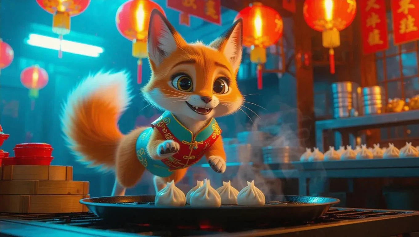 The imaginative little kitsune with a striking orange and light blue coat and gleaming, clever eyes scampers around the animated kitchen of a Chinese New Year food stall. It adeptly flips spring rolls on the hot griddle, while its tails sway in rhythm. The camera follows the kitsune's lively dance, showcasing the festive energy as it prepares dumplings with one hand and grins at the crowd. Bright lanterns, red envelopes, and sparkling fireworks enrich the lively atmosphere, making the scene vibrant and full of warmth.