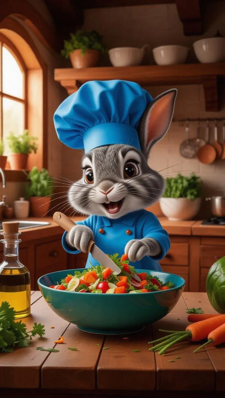 A cartoon rabbit in a blue chef's hat, energetically making a salad in a cozy, rustic kitchen. The rabbit is chopping a variety of fresh vegetables, surrounded by ingredients like carrots, lettuce, and olive oil. The kitchen features charming wooden accents, and the rabbit looks focused and slightly messy, with some lettuce leaves in its fur. A large bowl of colorful salad sits on the counter, with a few extra vegetables scattered around, adding a playful touch.