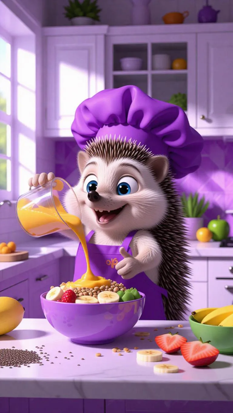 A cartoon hedgehog in a purple chef's hat, energetically making a smoothie bowl in a bright, airy kitchen. The hedgehog is blending fruits and pouring them into a bowl, surrounded by toppings like granola, chia seeds, and banana slices. The kitchen features light purple and white accents, and the hedgehog looks cheerful and slightly messy, with smoothie drips on its apron. A large smoothie bowl filled with colorful toppings sits on the counter, with a few extra fruits scattered around, adding a playful touch.