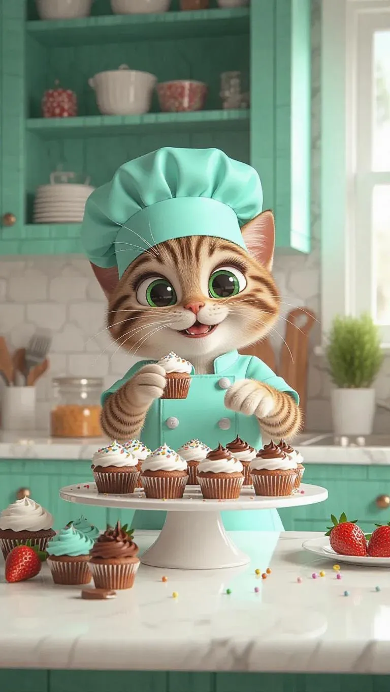 A cartoon cat in a mint chef's hat, energetically making cupcakes in a stylish, modern kitchen. The cat is icing cupcakes on a stand, surrounded by toppings like sprinkles, chocolate sauce, and strawberries. The kitchen features chic mint and white accents, and the cat looks thrilled and slightly messy, with icing on its whiskers. A large tower of colorful cupcakes sits on the counter, with a few sprinkles scattered around, adding a playful touch.