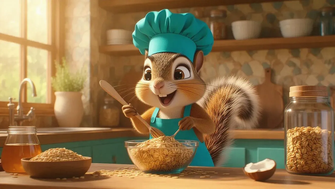A cartoon squirrel in a bright teal chef's hat, energetically making granola in a sunny, organic kitchen. The squirrel is mixing oats and nuts, surrounded by ingredients like honey, dried fruits, and coconut. The kitchen features warm teal and natural wood accents, and the squirrel looks cheerful and slightly messy, with granola bits on its cheeks. A large jar of homemade granola sits on the counter, with a few extra scoops scattered around, adding a playful touch.