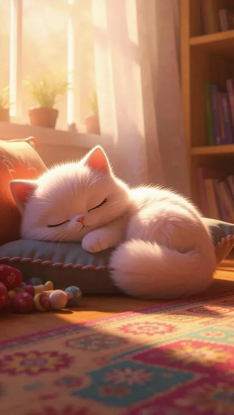Curled Up Sleeping: A fluffy, Jellycat-style kitty with soft, pastel pink fur and big, expressive eyes. The kitty is curled up in a cozy ball, sleeping peacefully on a soft cushion in a sunlit room. Plush toys are scattered nearby, and a colorful rug adds warmth to the scene. Soft, warm light filters through the window, casting gentle shadows and highlighting the kitty’s fluffy texture. The scene is serene and inviting, with a touch of whimsy, perfect for a children’s book illustration.