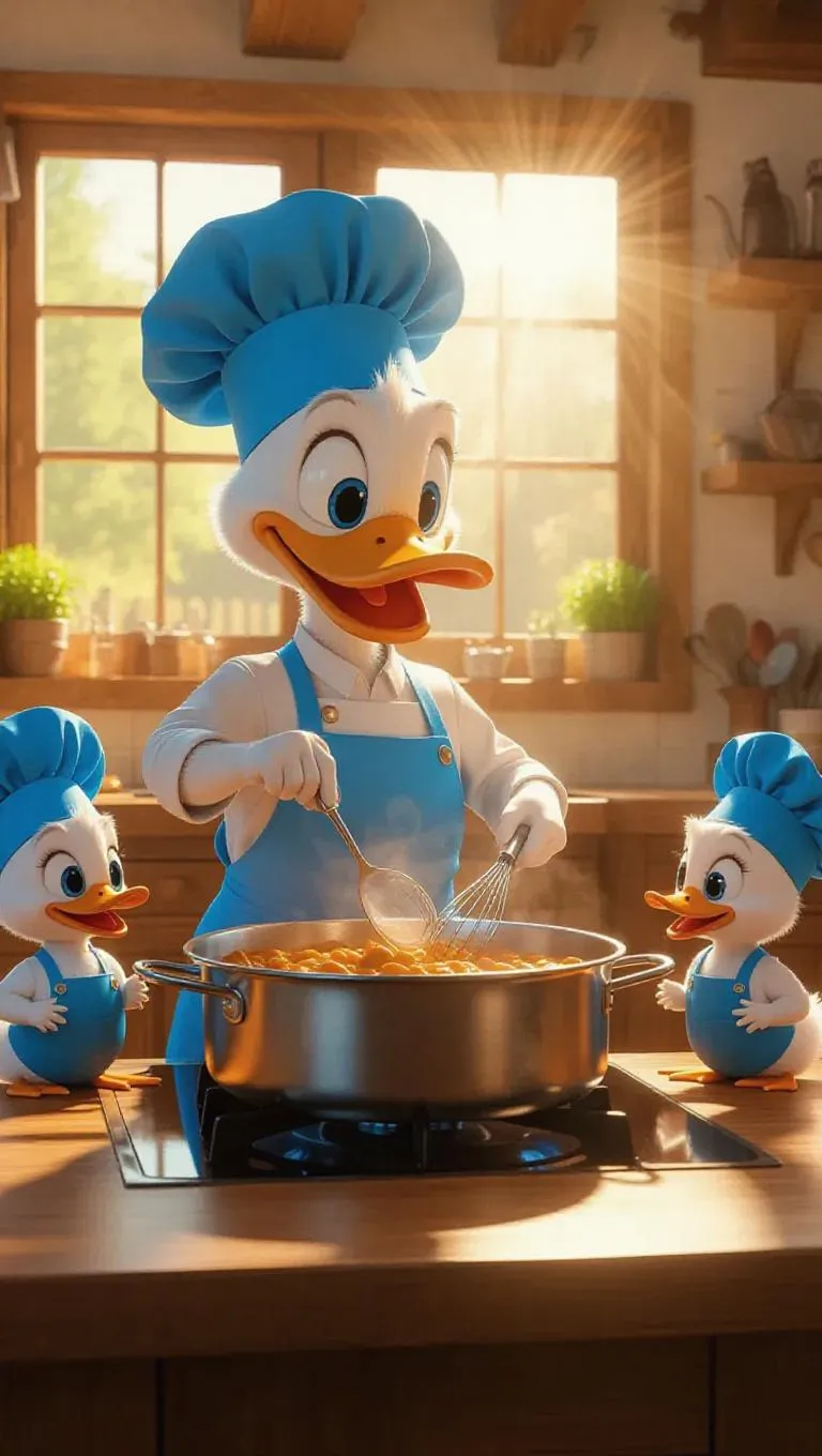 The cartoonish duck in a bright blue apron and chef hat stirs the fragrant pot of curry, its movements fluid and careful. The baby ducks, also dressed in blue aprons and chef hats, sit on the countertop, holding tiny whisks. They watch with excited anticipation as the big duck cooks. The bright, sunny farm kitchen adds a cheerful vibe, with beams of light bursting in through the open windows, creating playful patterns. The camera pans from the big duck to the baby ducks, capturing their delighted looks.