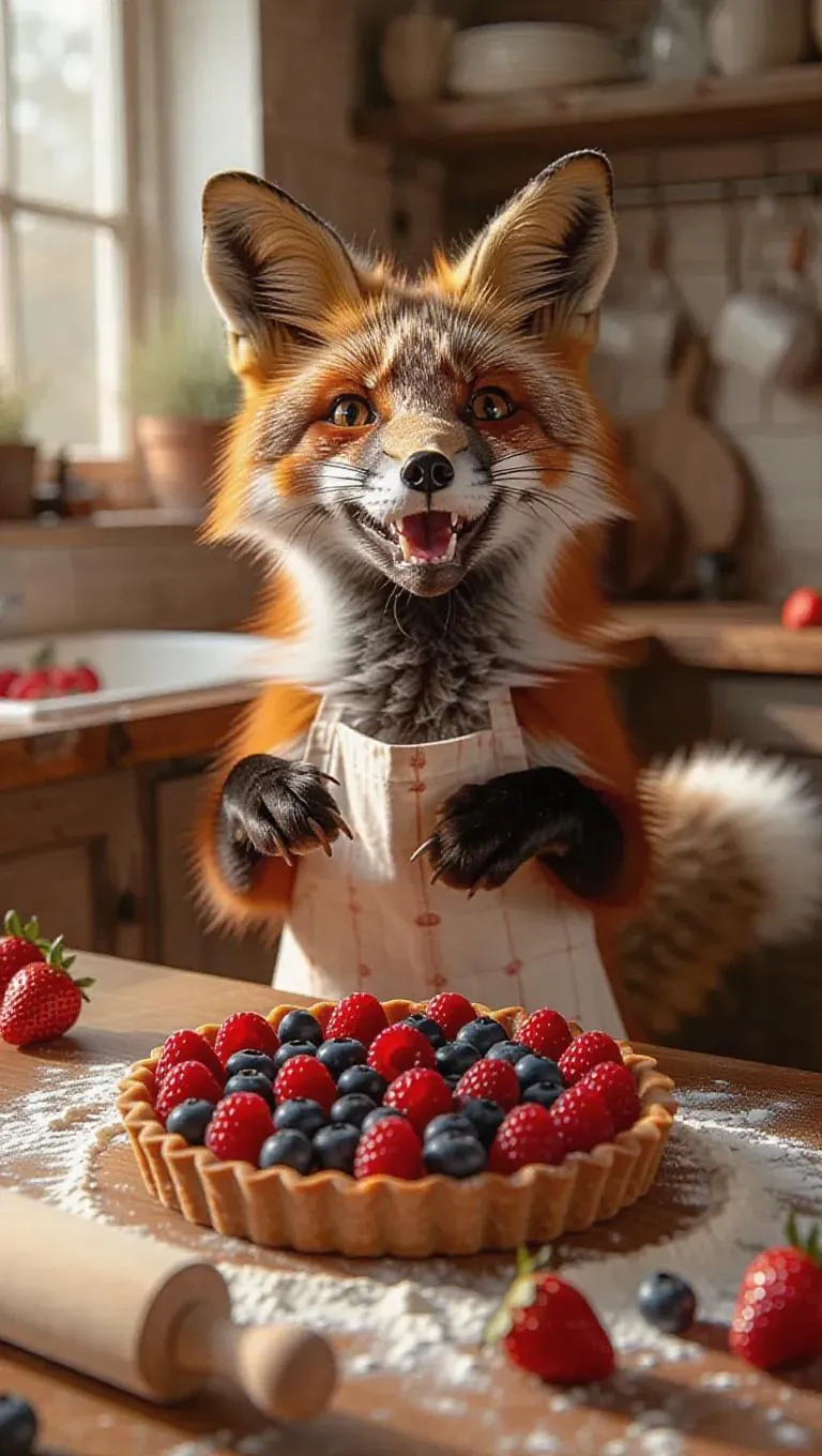 A playful fox, clad in a cute apron, is preparing a delightful berry tart in a sunny, inviting kitchen. Using its paws, it artfully arranges strawberries, raspberries, and blueberries on a crust. The table is scattered with flour and a rolling pin. Once complete, the fox wags its tail excitedly, howling with joy as it admires the stunning berry tart.