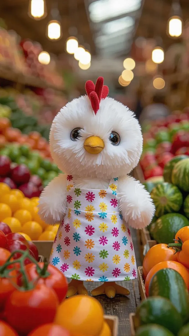 A fluffy, cute hen in a Jellycat style, wearing a delicate apron, stands confidently in a busy market. The hen's soft and warm feathers, with curious and lively eyes, shine amidst the vibrant stalls. Colorful fruits and vegetables surround it, creating a lively and bustling atmosphere. Style: Adorable realism.