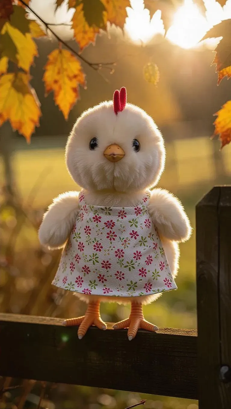 A fluffy, cute hen in a Jellycat style, wearing a delicate apron, stands proudly on a wooden fence. The hen's soft and warm feathers, with curious and lively eyes, shine in the picturesque countryside. Sunlight filters through the leaves, creating dappled patterns on the ground, enhancing the peaceful vibe. Style: Adorable realism.