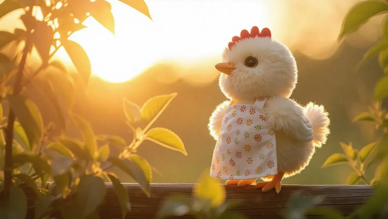 A fluffy, cute hen in a Jellycat style, wearing a delicate apron, stands attentively as it watches the sunrise. The hen's soft and warm feathers, with curious and lively eyes, shine in the early morning light. A soft breeze rustles the leaves, creating a peaceful and calming atmosphere. Style: Adorable realism.