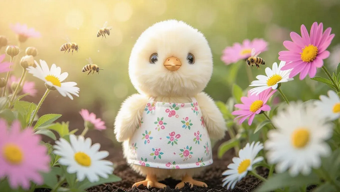 A fluffy, cute hen in a Jellycat style, wearing a delicate apron, stands curiously among blooming flowers. The hen's soft and warm feathers, with curious and lively eyes, shine in the fragrant garden. Bees buzz around, enhancing the lively and delightful atmosphere. Style: Adorable realism.