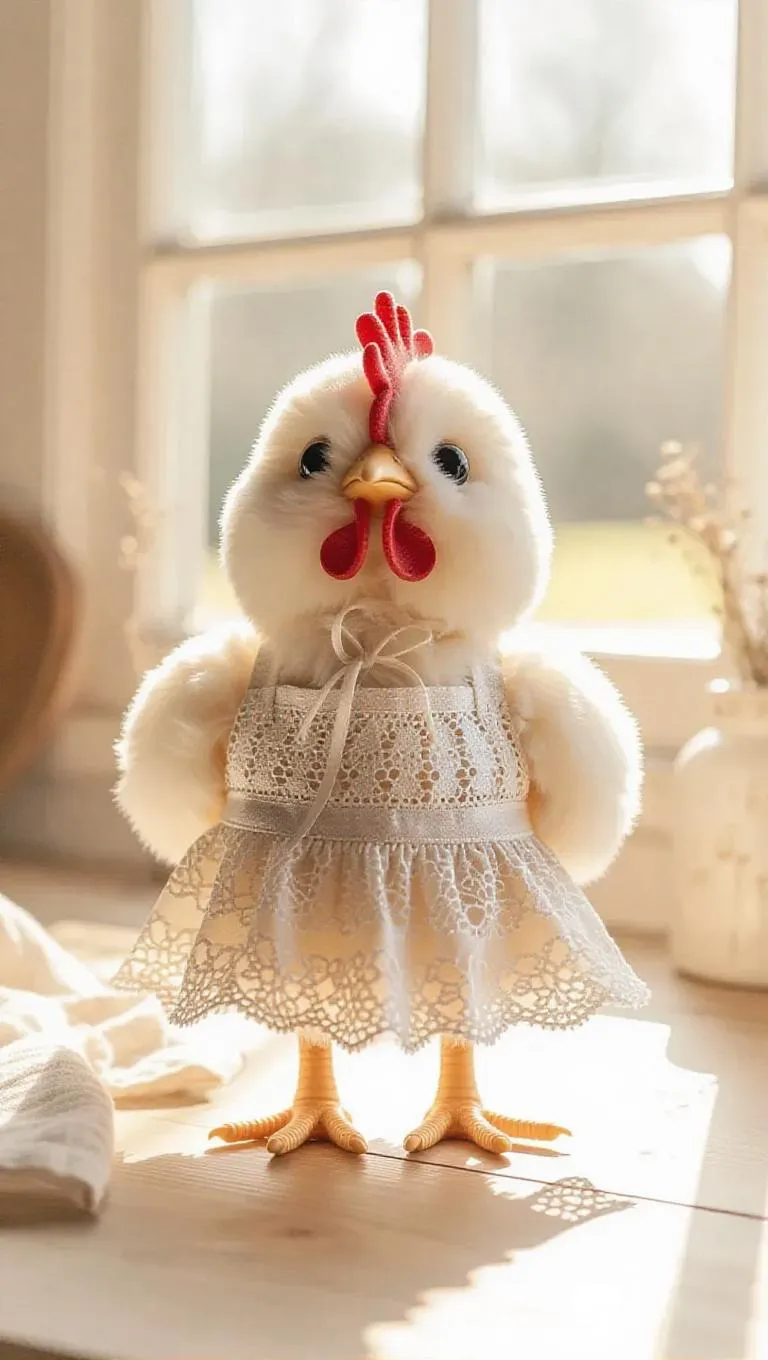 A fluffy, cute hen in a Jellycat style, wearing a vintage lace apron, stands confidently as it crows. The hen's soft and warm feathers, with curious and lively eyes, shine in the cozy country kitchen. Sunlight streams through the window, casting a warm, natural glow that illuminates every corner, creating a rustic and harmonious atmosphere. Style: Adorable realism.