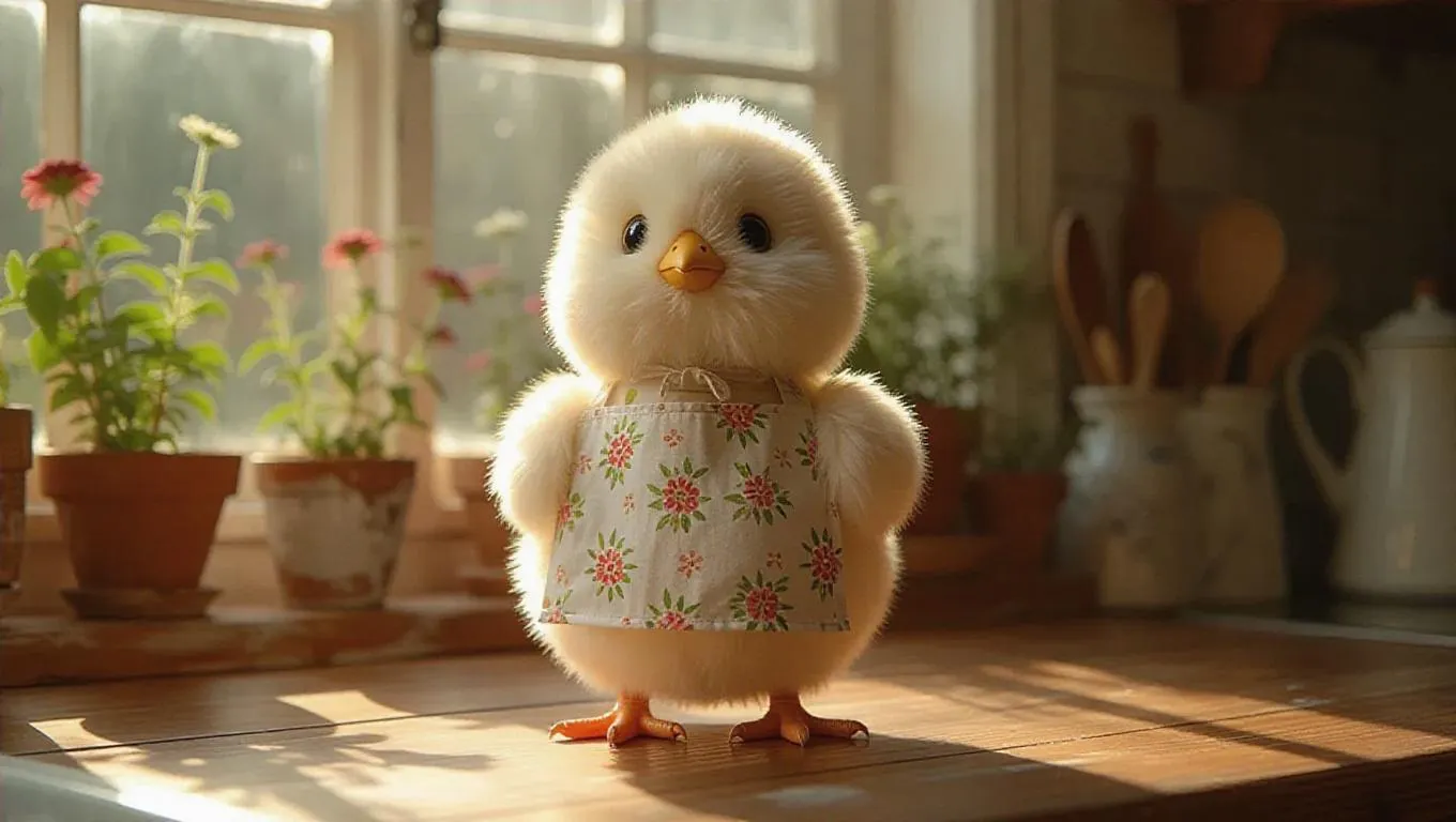A fluffy, cute hen in a Jellycat style, wearing a delicate floral apron, stands proudly as it poses. The hen's soft and warm feathers, with curious and lively eyes, shine in the cozy family kitchen. Sunlight streams through the window, casting a warm, natural glow that illuminates every corner, creating a heartwarming and harmonious atmosphere. Style: Adorable realism.