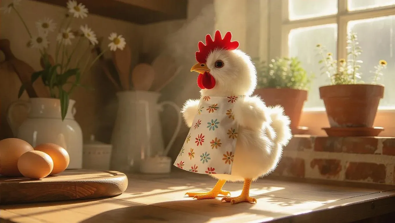 A fluffy, cute hen in a Jellycat style, wearing a delicate floral apron, stands confidently as it waddles. The hen's soft and warm feathers, with curious and lively eyes, shine in the rustic country kitchen. Sunlight streams through the window, casting a warm, natural glow that enhances every corner, creating a delightful and harmonious atmosphere. Style: Adorable realism.