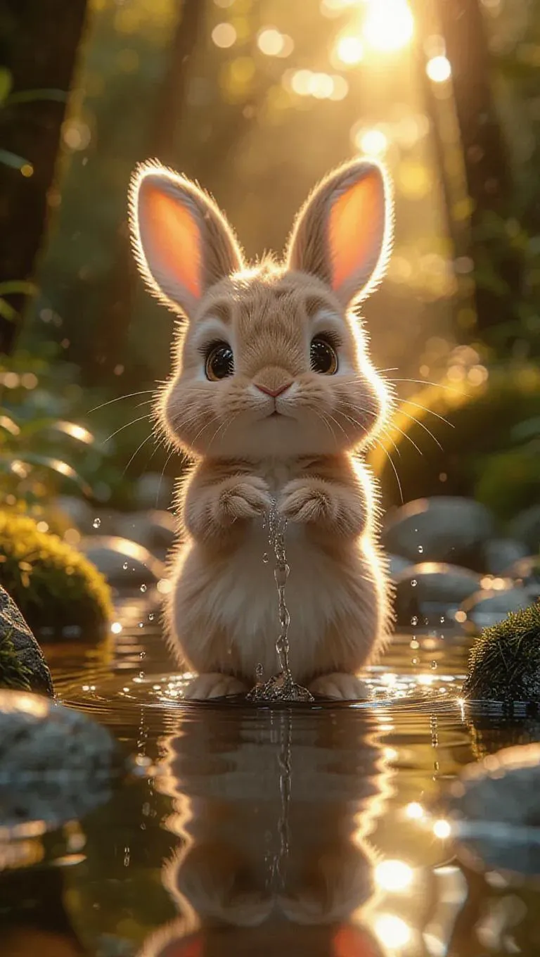 A fluffy, Jellycat-style little rabbit stands in a shallow, crystal-clear stream, playfully splashing water with its paws. Its large, expressive eyes are wide with curiosity, and its soft, pale gray fur glistens in the dappled sunlight. The rabbit's delicate ears perk up, adding to its endearing charm. The forest around it is bathed in warm, golden light, creating a cozy and inviting atmosphere. The scene is rendered in a soft, pastel color palette, enhancing the overall cuteness and innocence of the rabbit.