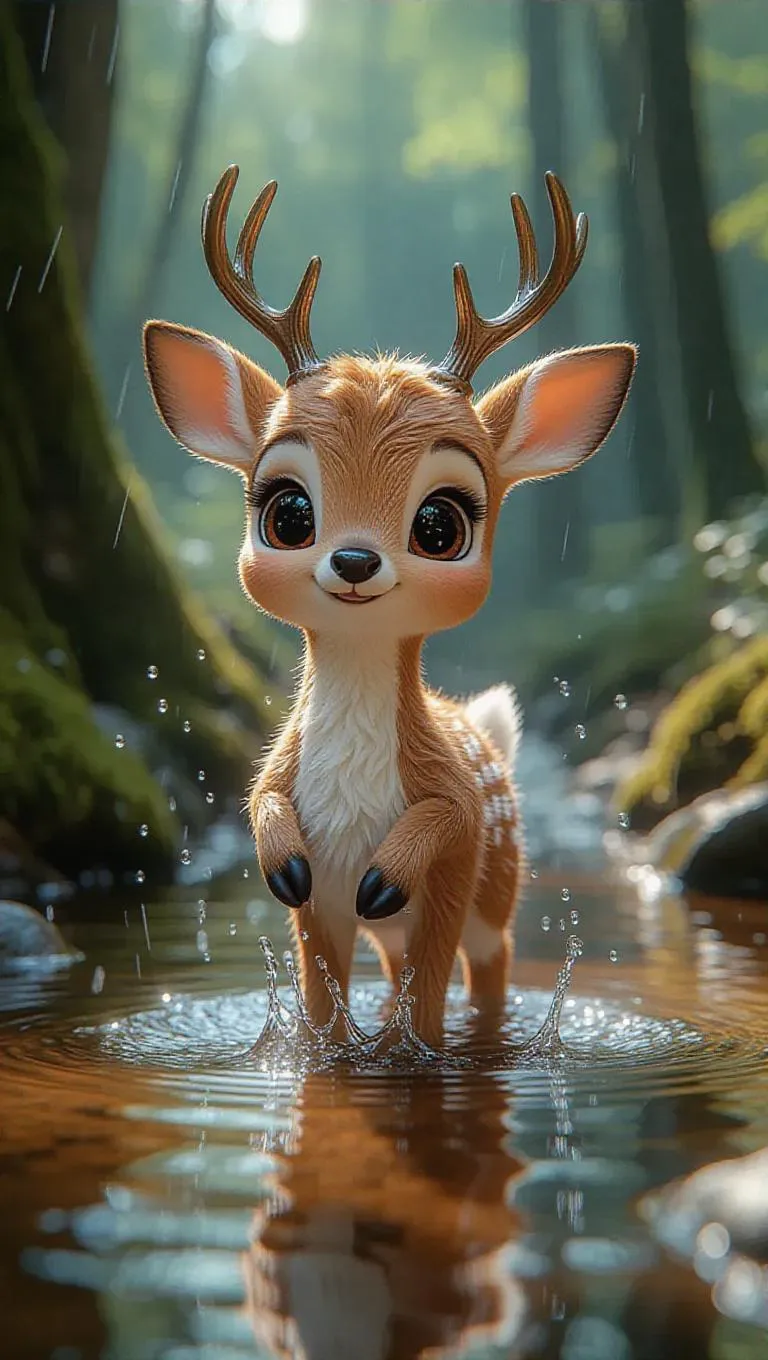 A fluffy, Jellycat-style little deer stands in a shallow, murky stream, playfully splashing water with its hooves. Its large, expressive eyes are wide with excitement, and its soft, pale gray fur glistens in the bright sunlight. The deer’s delicate antlers are fully grown, adding to its majestic charm. The forest around it is bathed in cool, blue light, creating a serene and tranquil atmosphere. The scene is rendered in a vibrant color palette, enhancing the overall beauty and grace of the deer.