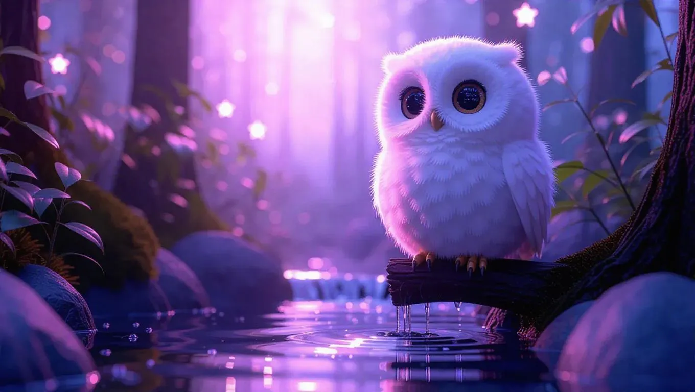 A fluffy, Jellycat-style little owl sits on a tree branch above a shallow, crystal-clear stream, watching the water playfully splash below. Its large, curious eyes twinkle with delight, and its soft, creamy feathers puff up against the evening light. The scene around it is adorned with gentle twinkling stars, adding to its enchanting charm. The forest is bathed in soft, lavender light, creating a dreamy and magical atmosphere. The scene is rendered in a whimsical, pastel color palette, enhancing the overall charm and innocence of the owl.
