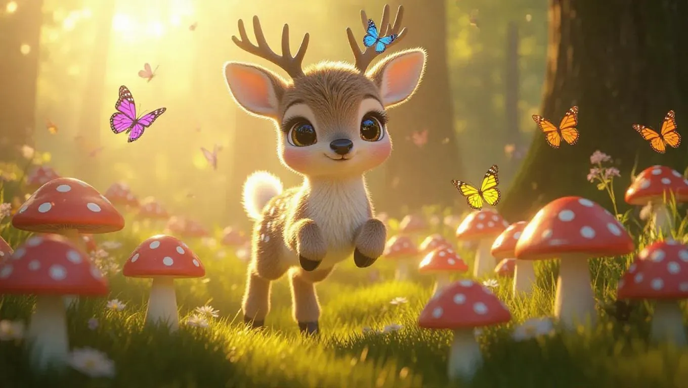 A fluffy, Jellycat-style little deer stands in a sunny glade, jumping over brightly colored mushrooms. Its large, bright eyes sparkle with energy, and its soft, pale gray fur shines in the midday sun. The deer’s small antlers are crowned with playful butterflies, enhancing its joyful appearance. The glade around it is filled with warm, golden light, creating a lively and cheerful atmosphere. The scene is rendered in vivid, bright colors, enhancing the overall playfulness and spirit of the deer.