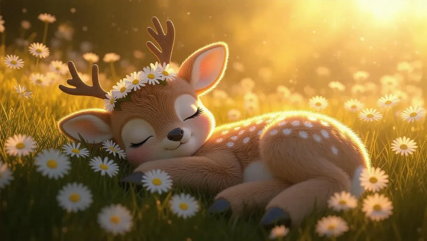 A fluffy, Jellycat-style little deer lounges on a sunny hillside, surrounded by bright daisies. Its large, sleepy eyes are half-closed in comfort, and its soft, pale gray fur glows in the afternoon light. The deer’s small antlers are draped with wildflowers, enhancing its serene appearance. The meadow around it is lit with warm, golden light, creating a peaceful and soothing atmosphere. The scene is rendered in gentle, earthy tones, enhancing the overall calmness and tranquility of the deer.