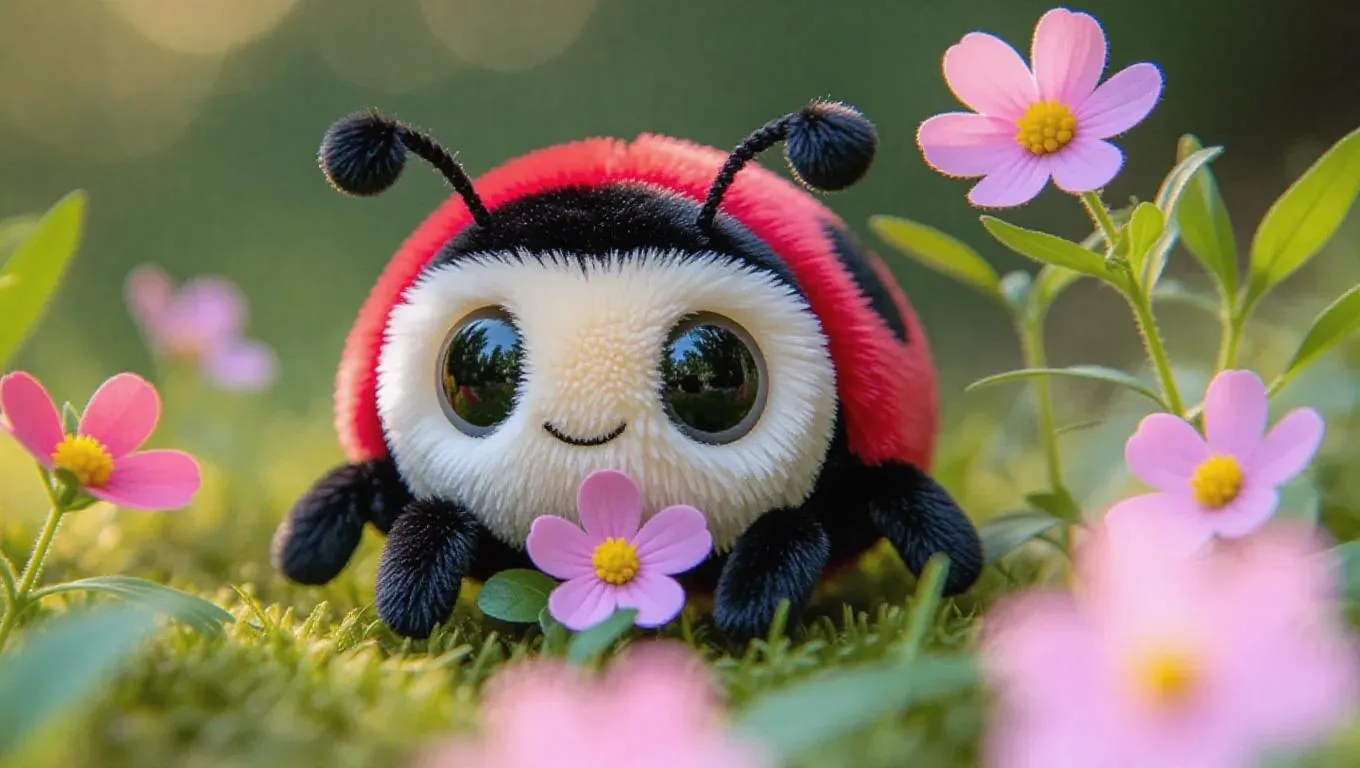 A fluffy, Jellycat-style ladybug with soft, rounded edges and large, expressive eyes. Its body is covered in plush, red and black fur, with tiny legs and a tiny, adorable flower in its grip. Crawling in a cozy, pastel-colored garden, under a gentle morning fog. Soft, warm light breaks through, casting gentle shadows and highlighting the ladybug's cuddly texture. The scene exudes a playful, whimsical charm, perfect for a children's storybook.