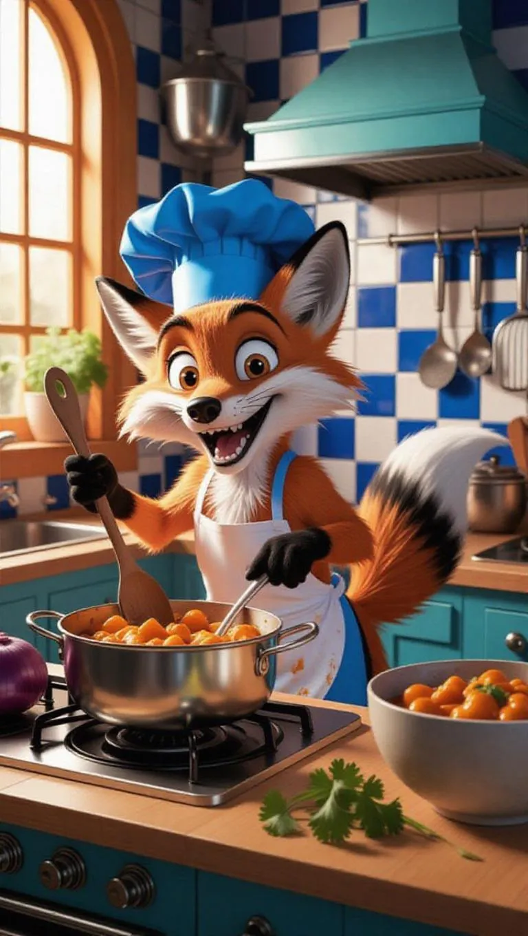 A cartoon fox in a blue chef's hat, energetically stirring a pot of chicken curry on a retro stove. The fox holds a wooden spoon, surrounded by fresh onions and cilantro. The kitchen is cozy, with blue and white tiles and a large window letting in warm sunlight. The fox looks excited and a bit messy, with curry splatters on its apron. A large bowl of curry sits on the counter, and a few utensils hang on the wall.