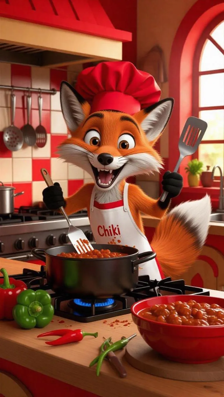 A cartoon fox in a red chef's hat, energetically stirring a pot of chili on a rustic stove. The fox holds a spatula, surrounded by fresh bell peppers and cumin. The kitchen is vibrant, with red and white tiles and a large window letting in bright daylight. The fox looks excited and a bit messy, with chili splatters on its apron. A large bowl of chili sits on the counter, and a few utensils hang on the wall.