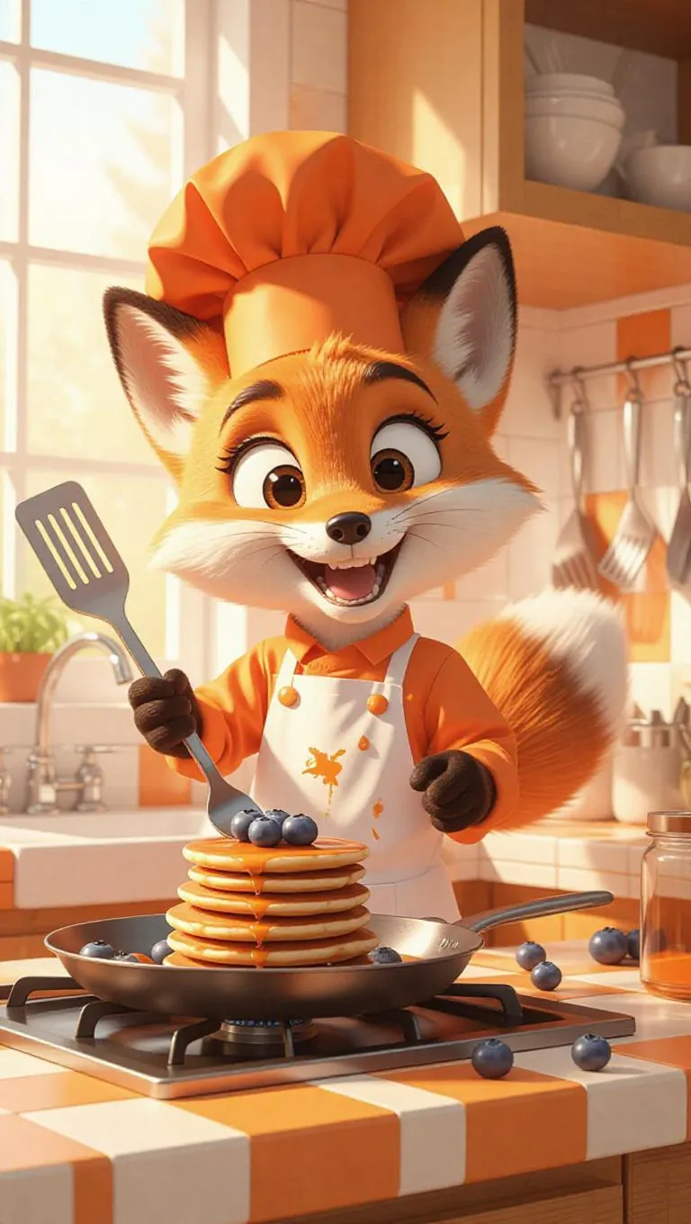 A cartoon fox in an orange chef's hat, energetically frying pancakes on a contemporary stovetop. The fox holds a spatula, surrounded by fresh syrup and blueberries. The kitchen is cheerful, with orange and white tiles and a large window letting in bright morning light. The fox looks excited and a bit messy, with syrup splashes on its apron. A stack of pancakes sits on the counter, and a few utensils hang on the wall.