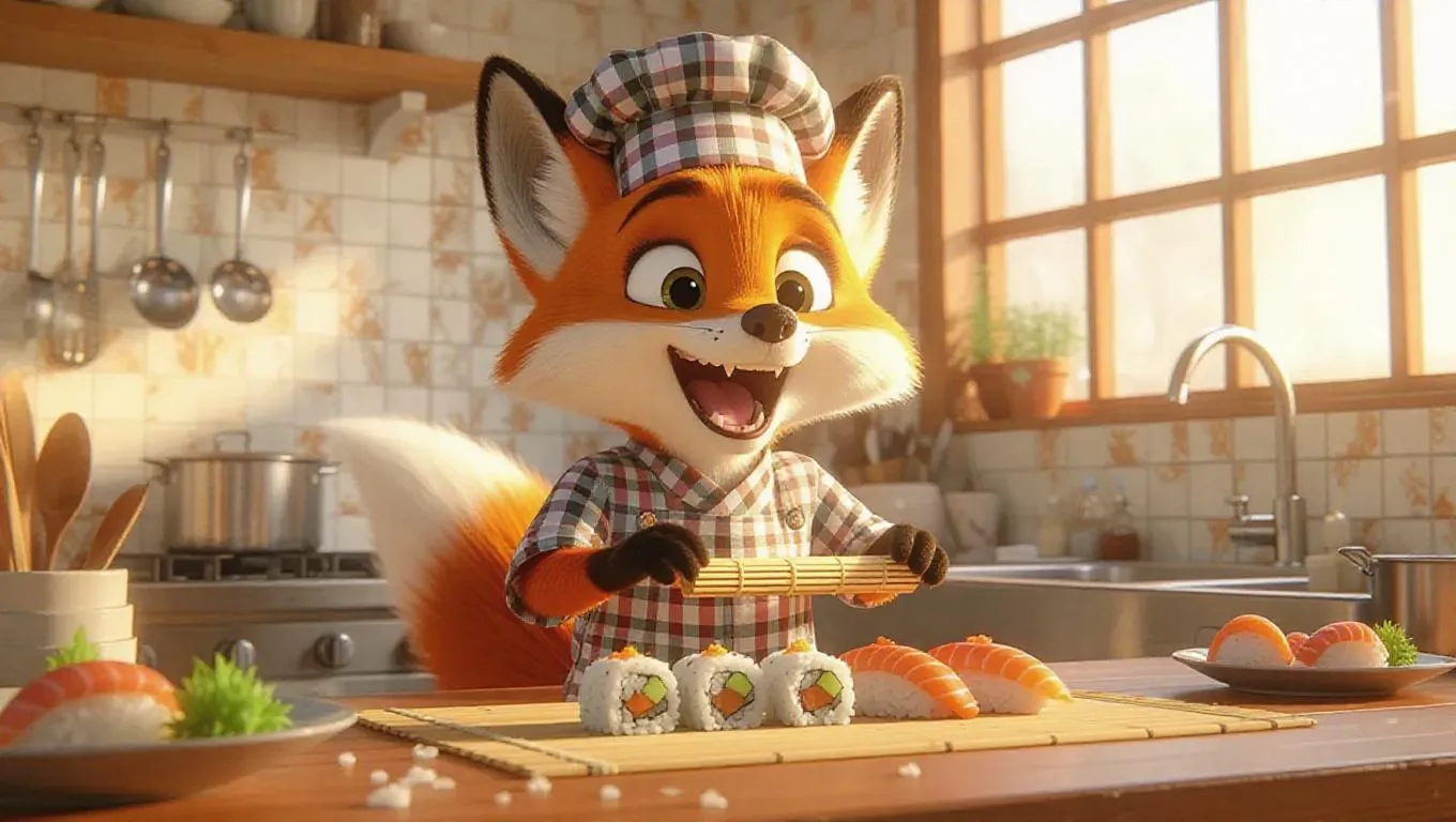 A cartoon fox in a plaid chef's hat, excitedly preparing sushi rolls on a modern sushi mat. The fox holds a bamboo mat, surrounded by fresh fish and rice. The kitchen is stylish, with plaid and white tiles and a large window letting in bright sunlight. The fox looks thrilled and a bit messy, with rice grains on its apron. A beautifully arranged platter of sushi sits on the counter, and a few utensils hang on the wall.