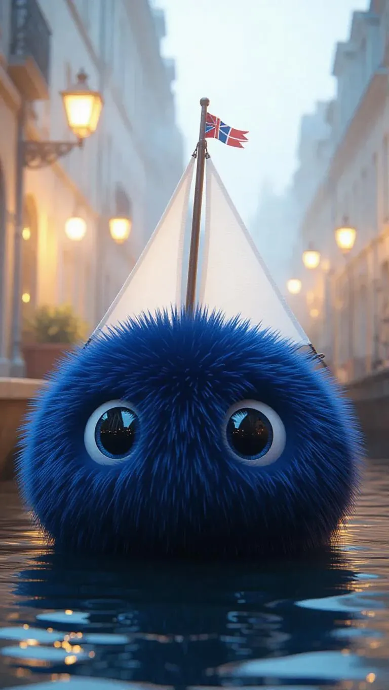 A fluffy, Jellycat-style boat with soft, rounded edges and large, expressive eyes. Its body is covered in plush, navy blue fur, with white sails and a tiny, adorable flag on top. Parked in a cozy, pastel-colored town, under a foggy sky. Soft, warm sunlight filters through, casting gentle shadows and highlighting the boat's cuddly texture. The scene exudes a playful, whimsical charm, perfect for a children's storybook.