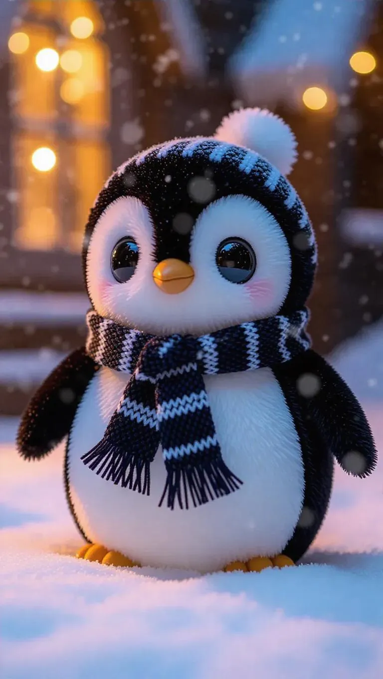 A fluffy, Jellycat-style penguin with soft, rounded edges and large, expressive eyes. Its body is covered in plush, black and white fur, with little flippers and a tiny, adorable scarf on top. Parked in a cozy, pastel-colored town, under a snowy sky. Soft, warm sunlight filters through, casting gentle shadows and highlighting the penguin's cuddly texture. The scene exudes a playful, whimsical charm, perfect for a children's storybook.