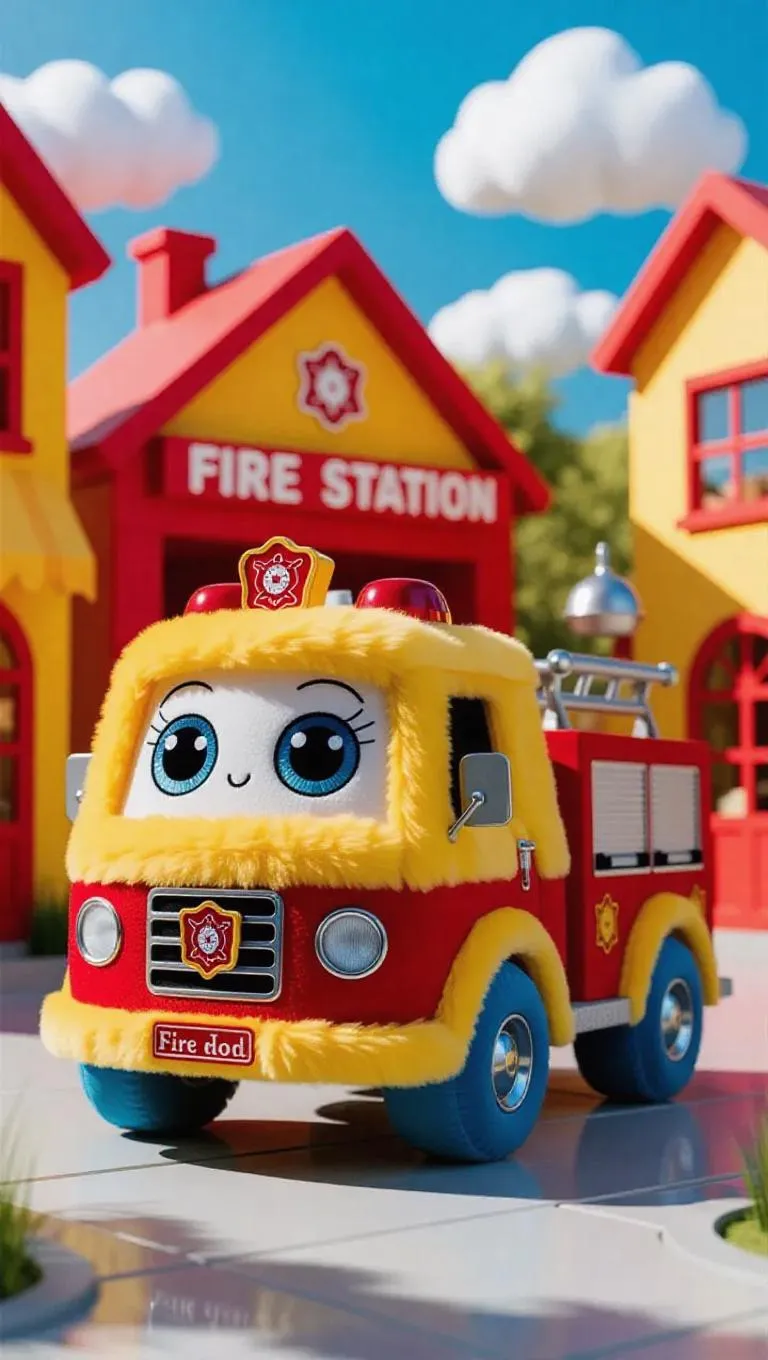 A fluffy, Jellycat-style fire truck with soft, rounded edges and large, expressive eyes is parked in front of a charming fire station in a vibrant, brightly-colored town. Its body is covered in plush, red and yellow fur, with blue paws and a tiny, adorable fire badge on top. The clear blue sky above is dotted with fluffy clouds, and soft, warm sunlight filters through, casting gentle shadows and highlighting the truck's cuddly texture. The scene exudes a playful, whimsical charm, perfect for a children's storybook.
