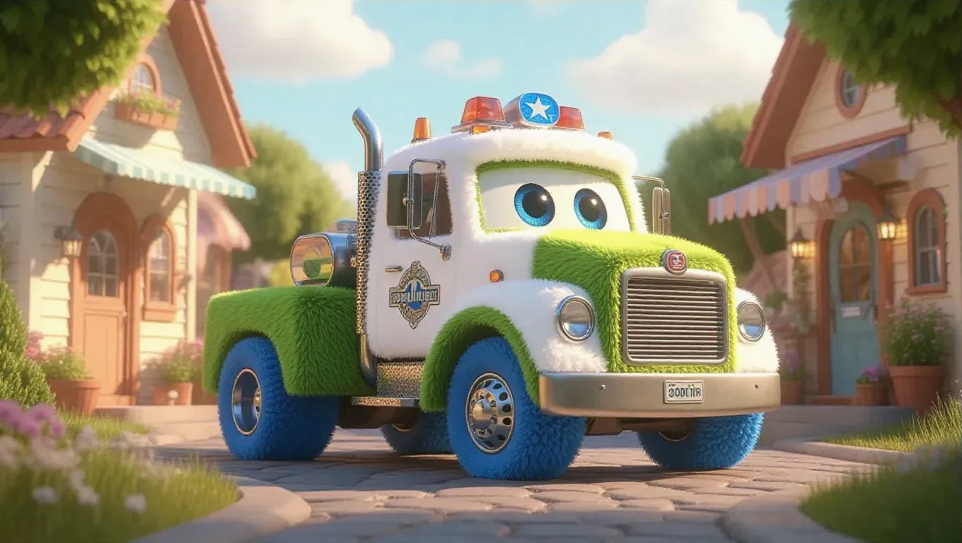 A fluffy, Jellycat-style tow truck with soft, rounded edges and large, expressive eyes is parked in front of a quaint repair shop in a cozy, pastel-colored town. Its body is covered in plush, green and white fur, with blue paws and a tiny, adorable tow badge on top. The clear blue sky above is dotted with fluffy clouds, and soft, warm sunlight filters through, casting gentle shadows and highlighting the truck's cuddly texture. The scene exudes a playful, whimsical charm, perfect for a children's storybook.