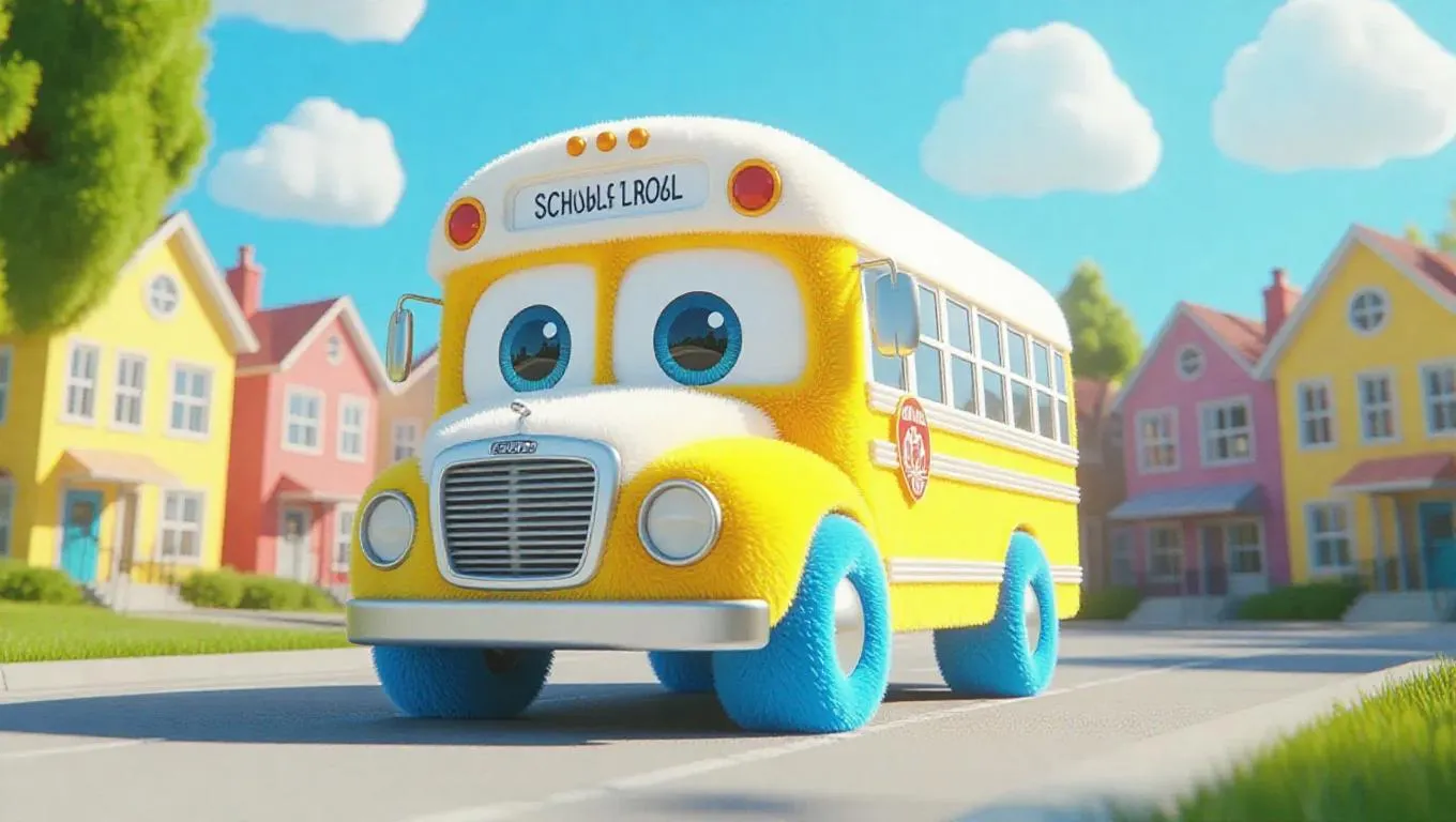 A fluffy, Jellycat-style school bus with soft, rounded edges and large, expressive eyes is parked in front of a cheerful elementary school in a bright, vibrant town. Its body is covered in plush, yellow and white fur, with blue paws and a tiny, adorable school badge on top. The clear blue sky above is dotted with fluffy clouds, and soft, warm sunlight filters through, casting gentle shadows and highlighting the bus's cuddly texture. The scene exudes a playful, whimsical charm, perfect for a children's storybook.