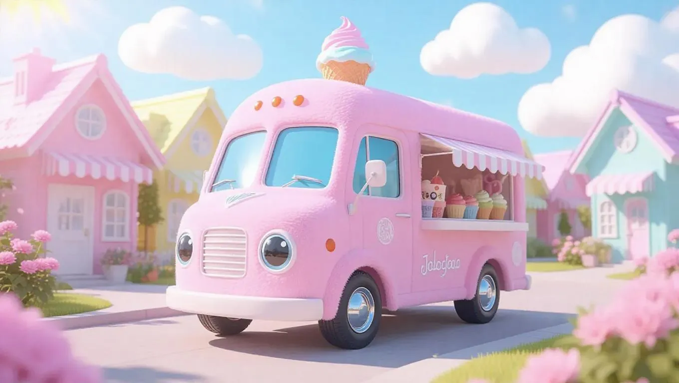 A cute, Jellycat-style ice cream truck with smooth, soft lines and large, gleaming eyes meanders through a delightful, pastel-hued community. Its surface is wrapped in fluffy, baby pink fur, with white paws and a small, delightful sundae perched high. The bright, azure sky is adorned with fluffy clouds, and cheerful sunlight filters through, creating gentle shadows that highlight the truck’s cuddly form. The environment radiates a joyous whimsy, perfect for a story for little ones.