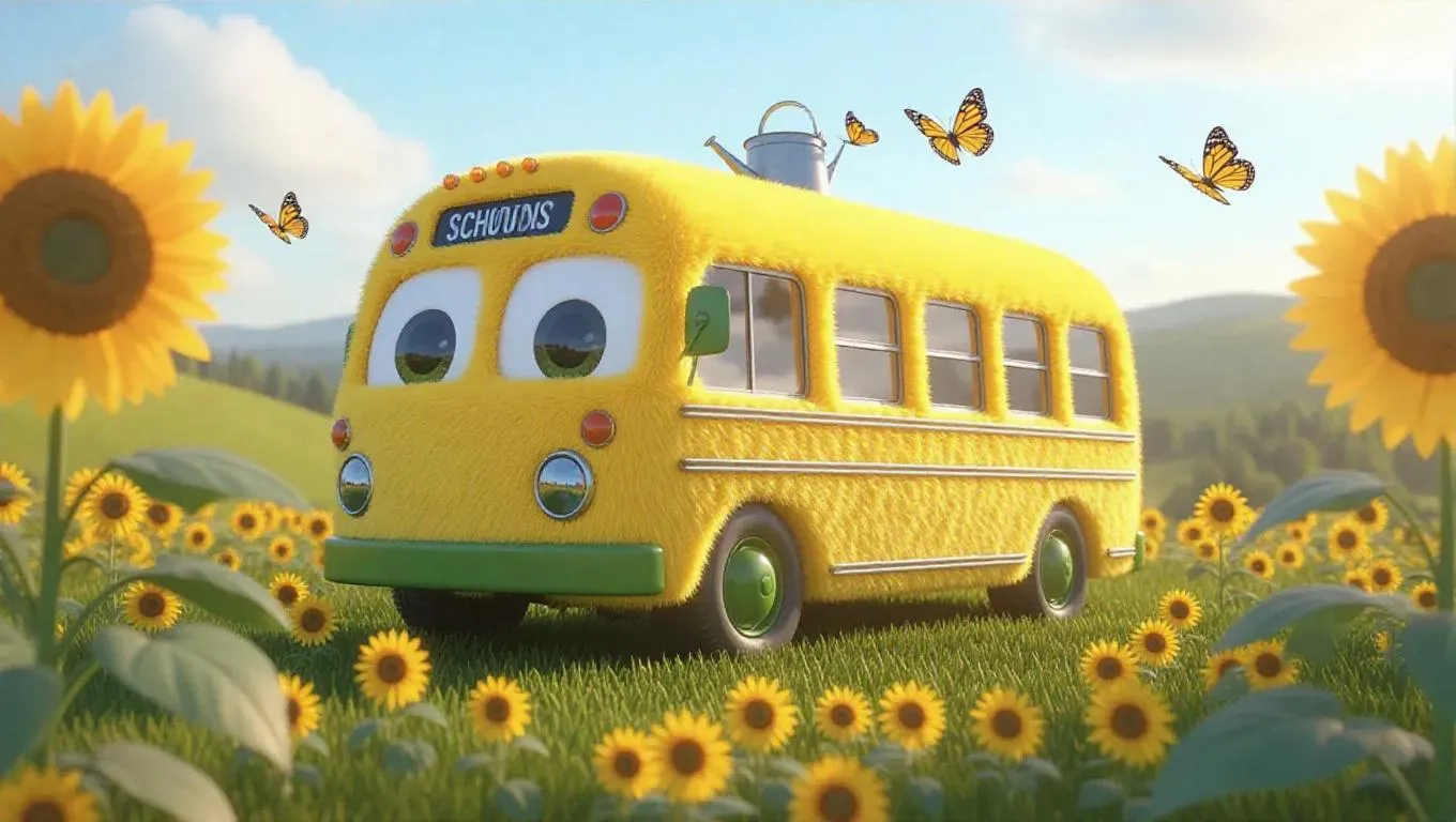 A fluffy, Jellycat-style school bus with soft, rounded edges and large, expressive eyes is parked on a hillside of blooming sunflowers in a sunny countryside. Its body is covered in plush, sunflower yellow fur, with green paws and a tiny watering can on top. The clear, bright sky is adorned with butterflies, and warm sunlight bathes the scene, bringing out the bus's cheerful charm. The atmosphere is full of joy and growth, perfect for a children's story about nature's wonders.