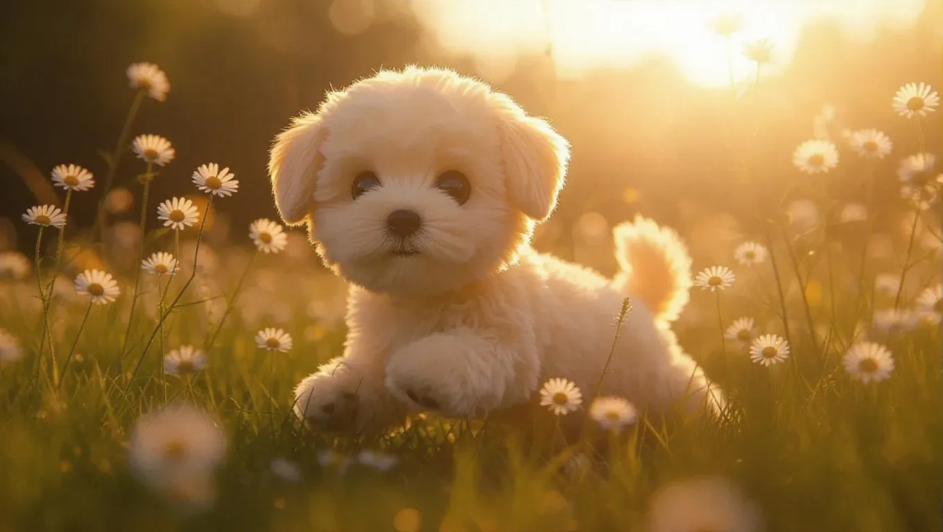 A fluffy, Jellycat-style little puppy frolics in a patch of wildflowers in a serene meadow. Its large, expressive eyes are wide with wonder, and its soft, yellow fur glistens in the dappled sunlight. The puppy's wagging tail adds to its endearing charm. The meadow around it is bathed in warm, golden light, creating a cozy and inviting atmosphere. The scene is rendered in a soft, pastel color palette, enhancing the overall cuteness and innocence of the puppy.