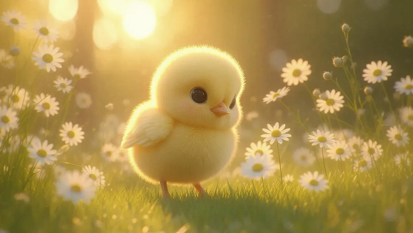 A fluffy, Jellycat-style little chick pecks at a patch of wildflowers in a serene meadow. Its large, expressive eyes are wide with wonder, and its soft, yellow feathers glisten in the dappled sunlight. The chick's tiny wings add to its endearing charm. The meadow around it is bathed in warm, golden light, creating a cozy and inviting atmosphere. The scene is rendered in a soft, pastel color palette, enhancing the overall cuteness and innocence of the chick.