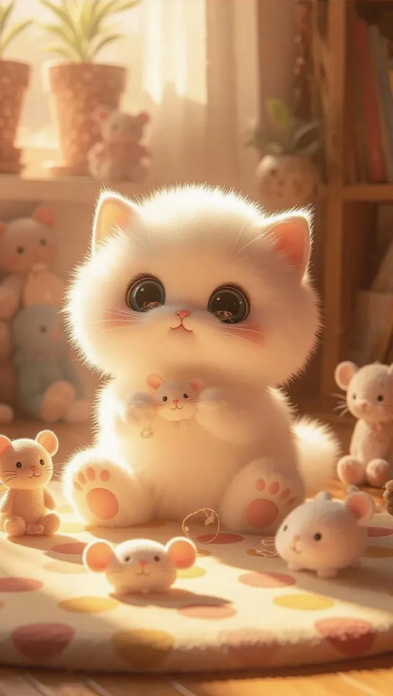 A fluffy, Jellycat-style kitty with soft, pastel fur and joyful, sparkling eyes. The kitty is playing with a toy mouse in a cozy, sunlit room. Plush toys are arranged around the kitty, and a polka-dot rug adds vibrancy to the scene. Soft, warm light filters through the window, casting gentle shadows and highlighting the kitty’s fluffy texture. The scene is fun and inviting, with a touch of whimsy, perfect for a children’s book illustration.