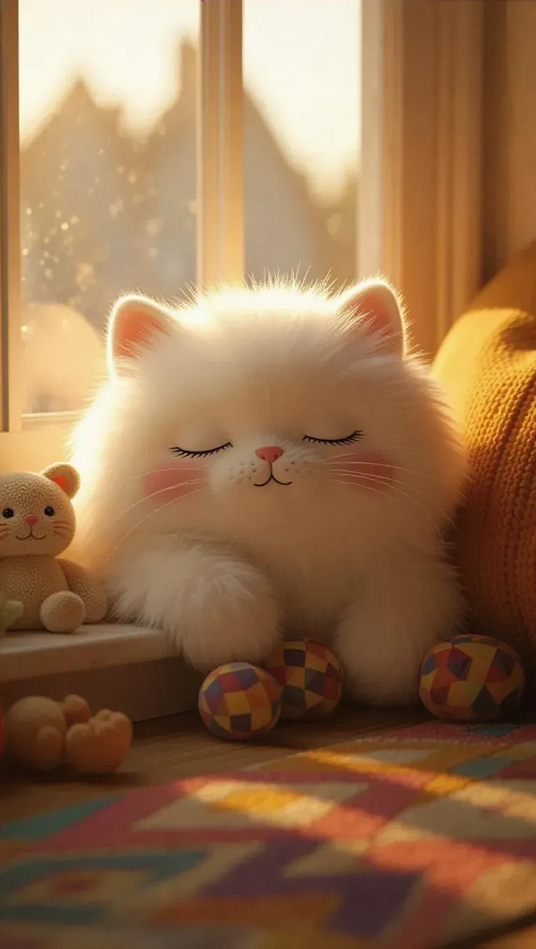 A fluffy, Jellycat-style cat with soft, pastel fur and big, peaceful eyes. The cat is lounging on a windowsill in a cozy, sunlit room. Plush toys are positioned around the cat, and a geometric rug adds vibrancy to the scene. Soft, warm light filters through the window, casting gentle shadows and highlighting the cat’s fluffy texture. The scene is calm and inviting, with a touch of whimsy, perfect for a children’s book illustration.