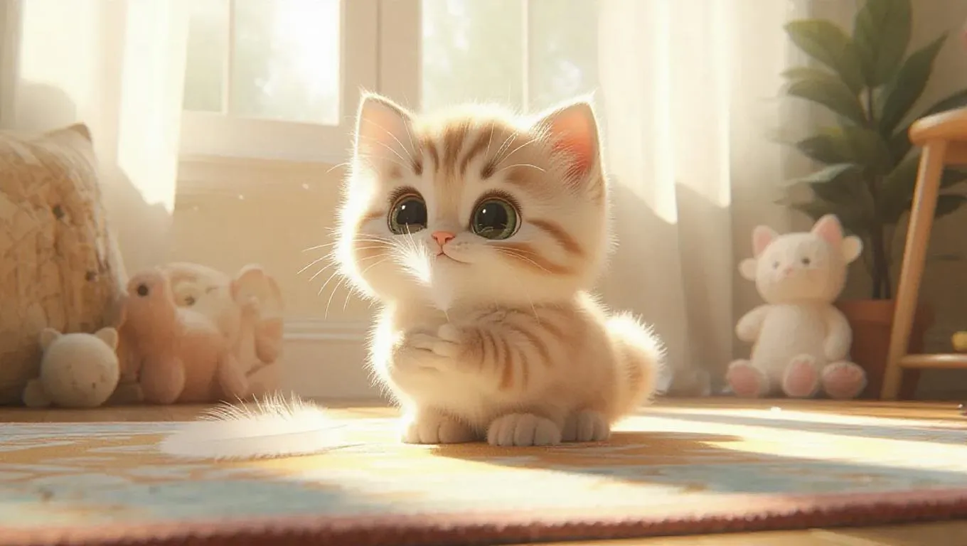A fluffy, Jellycat-style kitten with soft, pastel fur and excited, glimmering eyes. The kitten is playing with a feather in a cozy, sunlit room. Plush toys are organized around the kitten, and a whimsical rug adds vibrancy to the scene. Soft, warm light filters through the window, casting gentle shadows and highlighting the kitten’s fluffy texture. The scene is animated and inviting, with a touch of playfulness, perfect for a children’s book illustration.