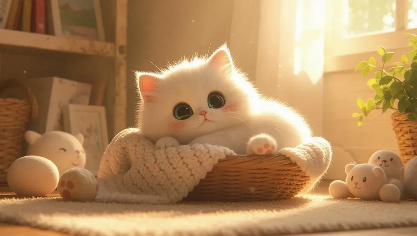 A fluffy, Jellycat-style kitten with soft, pastel fur and gentle, dreamy eyes. The kitten is curled up in a basket in a cozy, sunlit room. Plush toys are placed around the basket, and a soft rug adds vibrancy to the scene. Soft, warm light filters through the window, casting gentle shadows and highlighting the kitten’s fluffy texture. The scene is cozy and inviting, with a touch of whimsy, perfect for a children’s book illustration.
