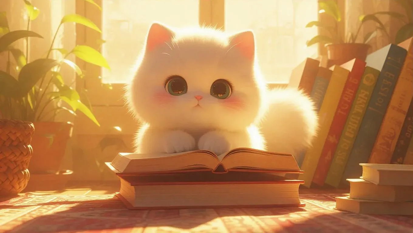 A fluffy, Jellycat-style kitty with soft, pastel fur and wide, innocent eyes. The kitty is exploring a stack of books in a cozy, sunlit room. Plush toys are situated around the kitty, and a colorful patterned rug adds vibrancy to the scene. Soft, warm light filters through the window, casting gentle shadows and highlighting the kitty’s fluffy texture. The scene is explorative and inviting, perfect for a children’s book illustration.