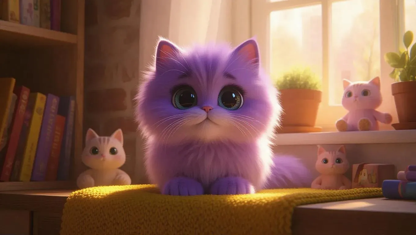 A fluffy, Jellycat-style cat with soft, lavender fur and curious, sparkling eyes. The cat is balancing on a windowsill in a cozy, sunlit room. Plush toys are neatly positioned around the cat, and a pastel yellow rug adds vibrancy to the scene. Soft, warm light filters through the window, casting gentle shadows and highlighting the cat’s fluffy texture. The scene is whimsical and inviting, perfect for a children’s book illustration.