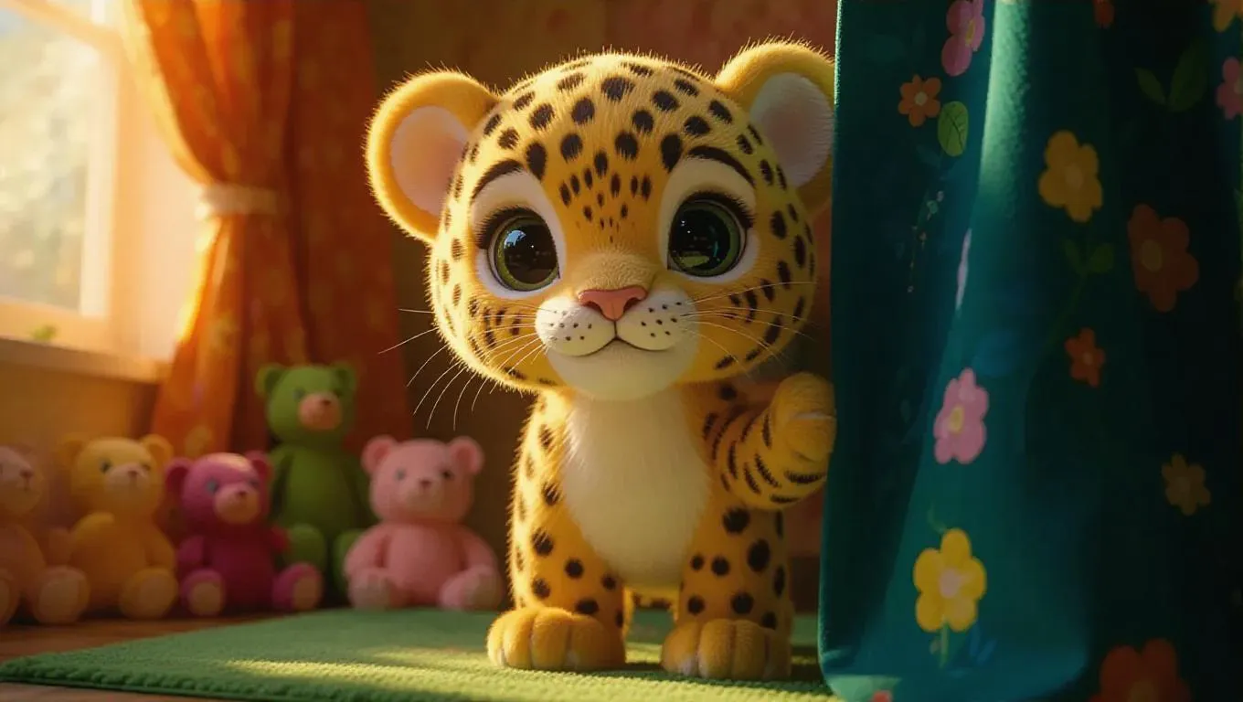 A fluffy, Jellycat-style leopard with soft, spotted pastel fur and big, curious eyes. The leopard is standing on its hind legs, peeking out from behind a curtain in a cozy, sunlit room. Plush toys are arranged around the leopard, and a vibrant green rug adds liveliness to the scene. Soft, warm light filters through the window, casting gentle shadows and highlighting the leopard’s fluffy texture. The scene is playful and inviting, perfect for a children’s book illustration.