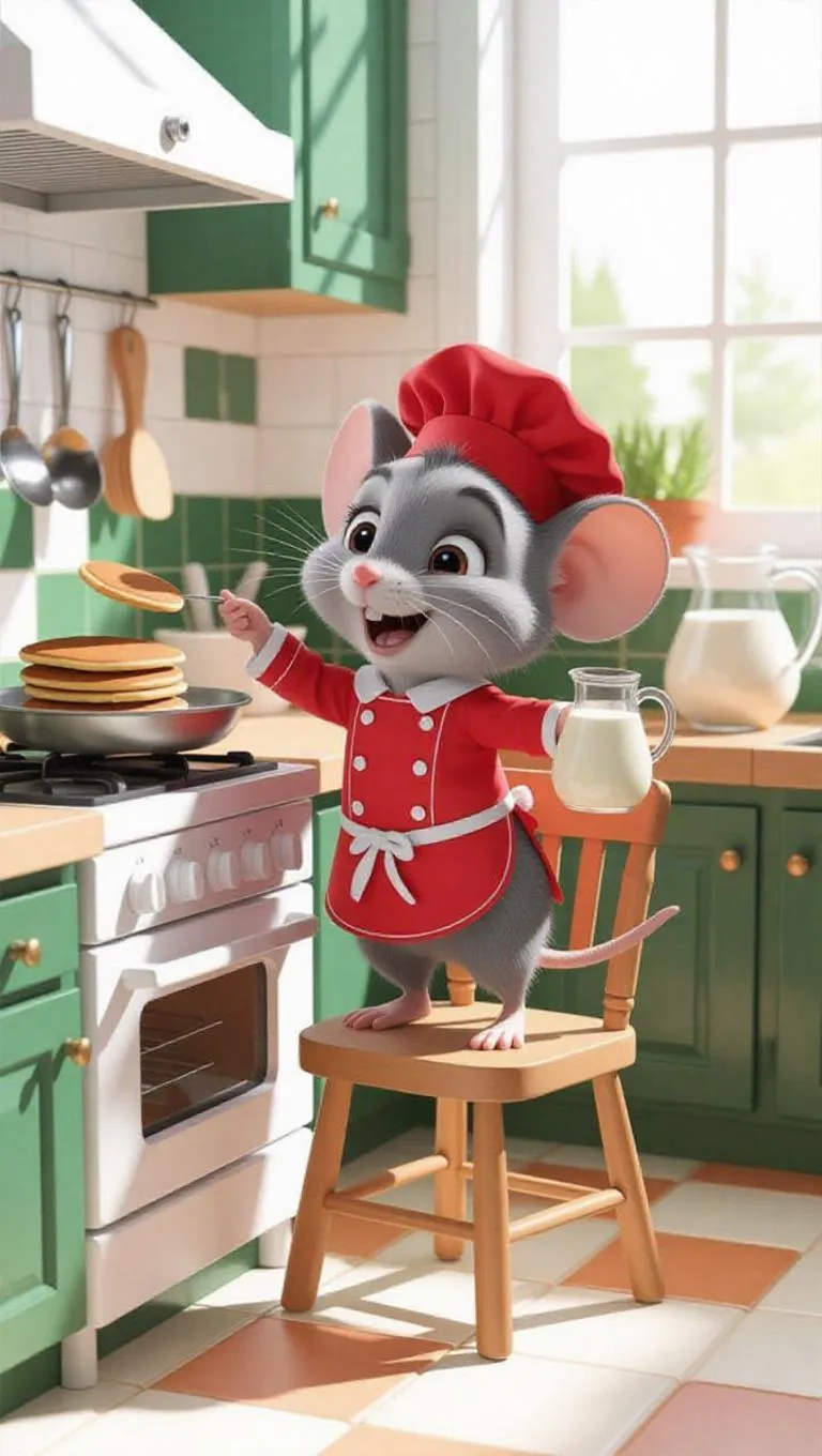 A tiny cartoon mouse in a red chef's outfit, standing on a kitchen chair to reach the stove, flipping a pancake with a spoon. A few berry pancakes are stacked on a nearby plate. The bright, cheerful kitchen features green and white tiles, a large window letting in bright sunlight, and a small jug of milk in the mouse’s other hand. Kitchen utensils hang on the wall, and a container of batter sits on the counter. The mouse looks happy yet a bit flustered.