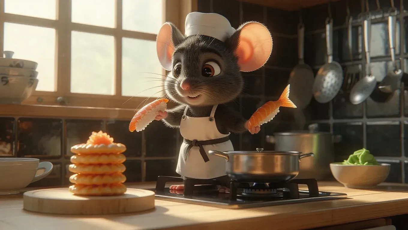 A tiny cartoon mouse dressed as a sushi chef, standing on a low shelf to reach the stove, flipping a pancake with a sushi mat. A few sushi-shaped pancakes are stacked on a wooden board. The bright, cheerful kitchen features black and grey tiles, a large window letting in zen-like light, and a small fish in the mouse’s other hand. Various kitchen utensils hang on the wall, and a bowl of wasabi sits on the counter. The mouse looks focused yet a bit anxious.