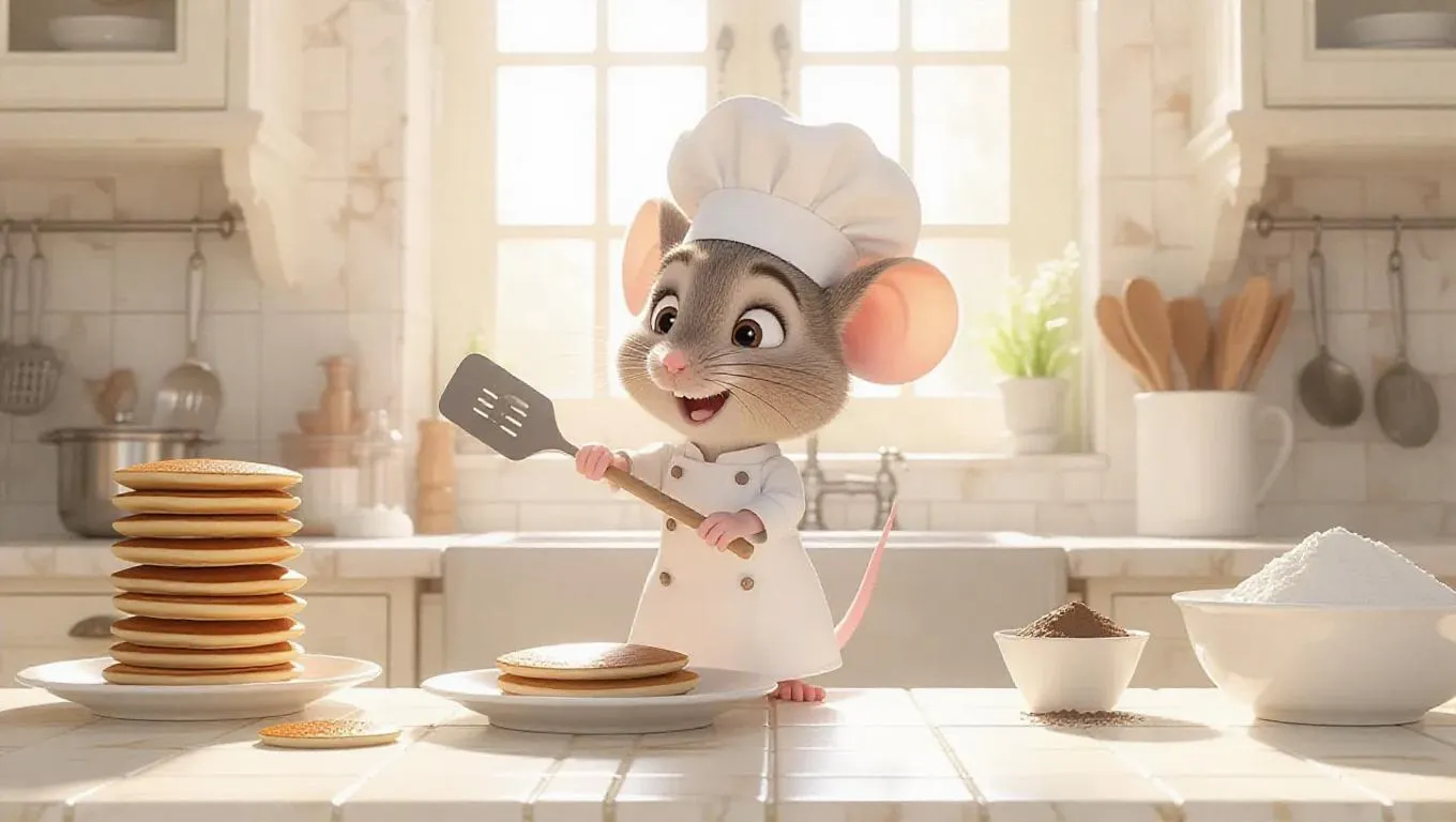 A tiny cartoon mouse in a spotless white chef's uniform, standing on a stool to reach the stove, flipping a pancake with a spatula. Several perfectly round pancakes are stacked on a nearby plate. The kitchen is elegant, with cream and white tiles, a large window letting in bright light, and a bowl of flour in the mouse's other hand. Kitchen utensils hang neatly on a rail, and a bowl of cocoa powder is on the counter. The mouse looks meticulous yet slightly anxious.