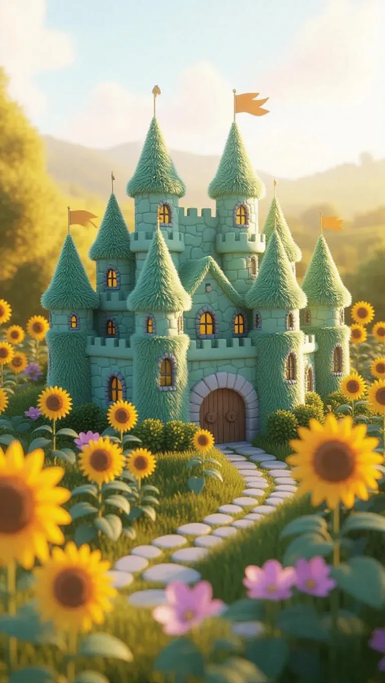 An adorable Jellycat-style stronghold with fluffy, cozy textures. The stronghold features short, squat towers and walls, covered in plush, pastel green fur. The landscape around it is vibrant and bustling, with sprawling fields and bright sunflowers. Warm, radiant light brightens the scene, creating a lively and welcoming atmosphere. The style is fun and playful, reflecting a child's joyful dreams.