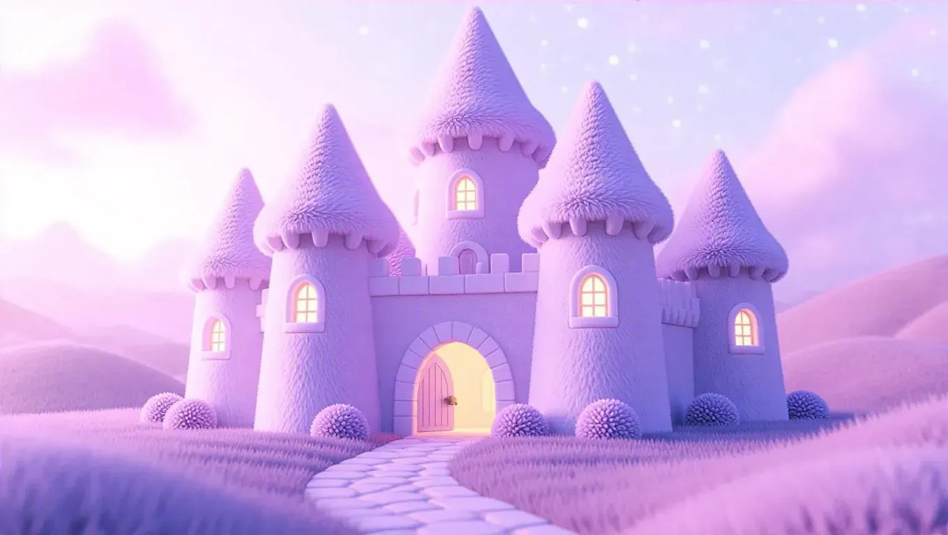 A delightful Jellycat-style fortress with fluffy, cozy textures. The fortress features wide, round towers and walls, adorned with plush, pastel lilac fur. The landscape around it is tranquil and calm, filled with soft meadows and twinkling stars. Gentle, soft light bathes the scene, creating a peaceful and soothing ambiance. The style is charming and whimsical, reminiscent of a magical night.