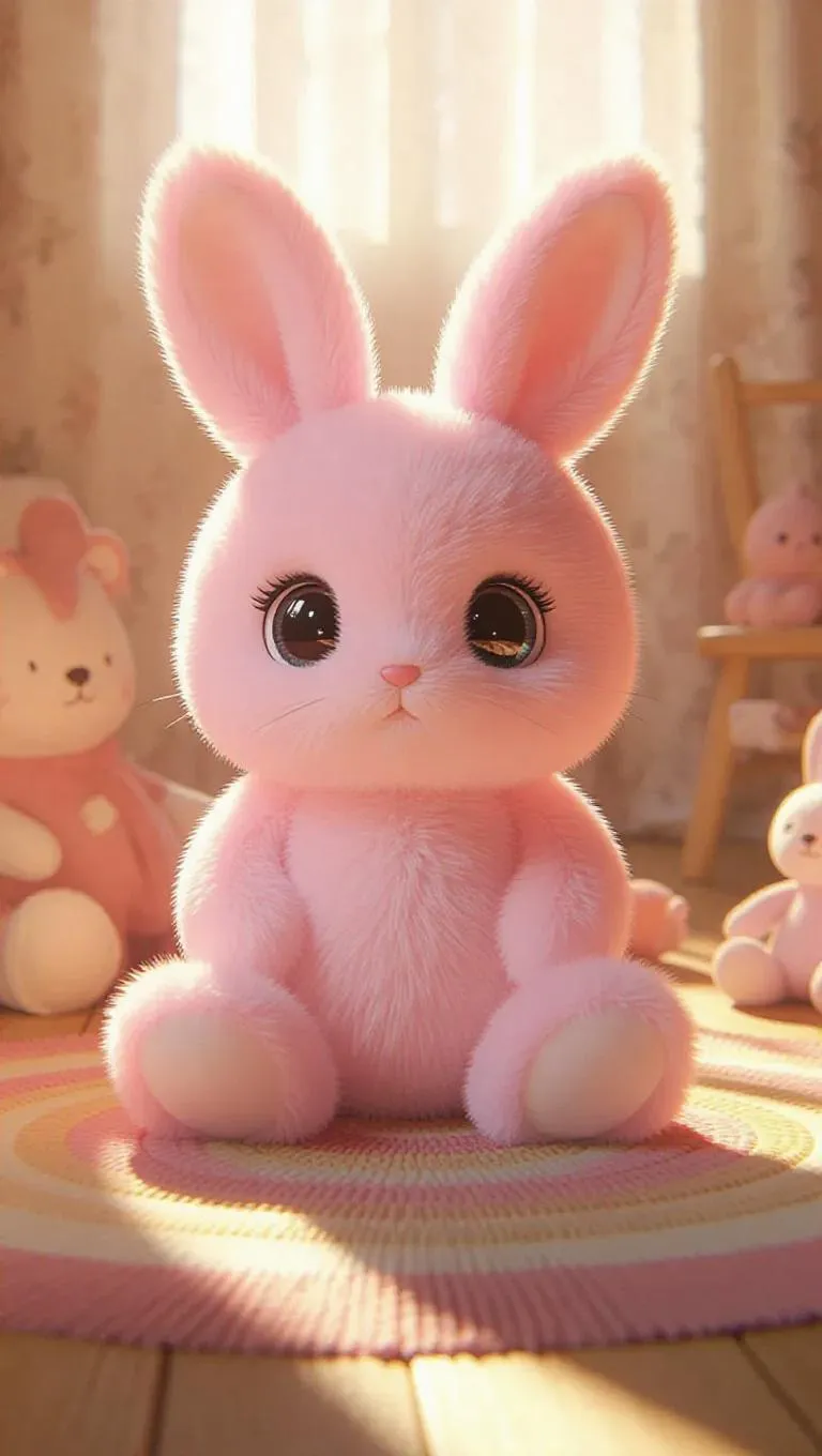 A fluffy, Jellycat-style bunny with soft, pastel pink fur and big, expressive eyes. The bunny is sitting upright, ears perked, in a cozy, sunlit room. Plush toys surround it in a circle, and a striped rug adds a fun element to the scene. Soft, warm light filters through the curtains, casting delicate shadows and enhancing the bunny’s fluffy fur. The scene is whimsical and inviting, perfect for a children’s book illustration.