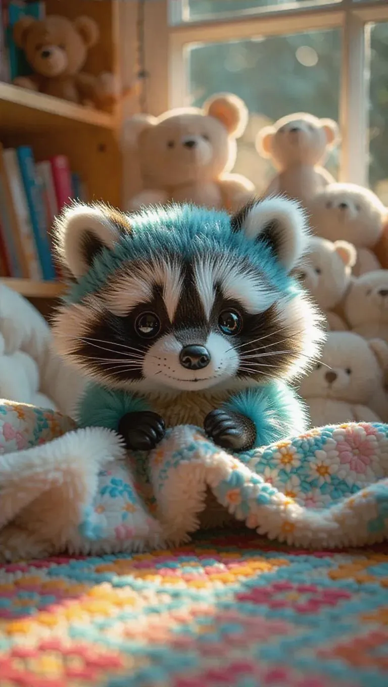 A fluffy, Jellycat-style raccoon with soft, pastel teal fur and big, expressive eyes. The raccoon is peeking over a plush toy, in a cozy, sun-drenched room. Plush toys are piled high, and a whimsical rug adds color to the scene. Soft, summer light pours through the glass, casting playful shadows and enhancing the raccoon’s fluffy texture. The scene is lively and inviting, excellent for a children’s book illustration.
